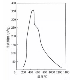 氢氧化铝在煅烧的过程中比表面积随温度的变化如图,在240℃时比表面积急剧增加,到400℃左右达到极大值。