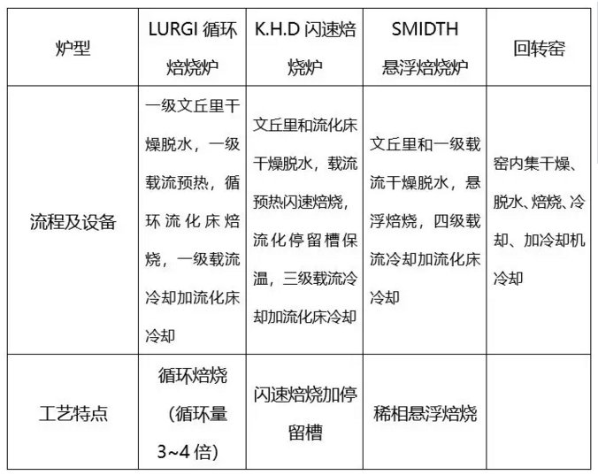 现在应用于工业生产的三种类型的流态化焙烧技术和装置,与回转窑相比,虽然都具有技术先进、经济合理的共同点,但各种炉型各具特点,有人将氧化铝焙烧分为三代:第一代为回转窑,第二代为稀相与浓相液态化相结合的流态化焙烧,第三代为稀相流态化的气态悬浮焙烧。